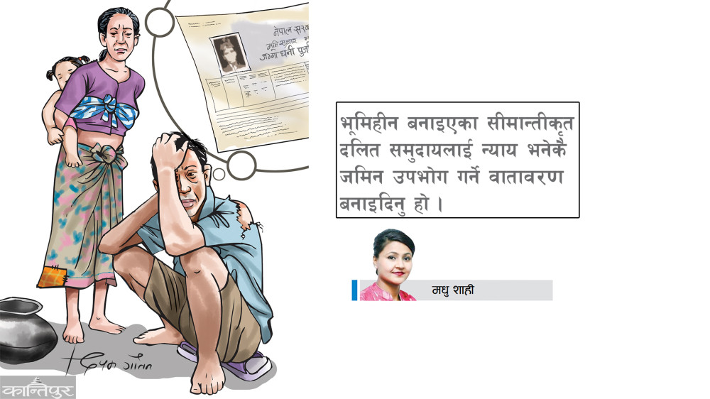 संविधानले दलितलाई एक पटक भूमि दिने नीति ल्याए पनि त्यसको व्यावहारिक कार्यान्वयन हुन सकेको छैन । आर्थिक रूपले सबल नहुँदासम्म कुनै पनि समुदायको अस्तित्वरक्षा जटिल हुन्छ । त्यसैले भूमिहीन बनाइएका सीमान्तीकृत दलित समुदायलाई न्याय भनेकै जमिन उपभोग गर्ने वातावरण बनाइदिनु हो । बस्ने थलो नभएका समुदायले समाजमा कस्तो परिवर्तन ल्याउलान् ? र राज्यले उनीहरूको समृद्धिको अपेक्षा कहिलेसम्म गर्न मिल्छ ?